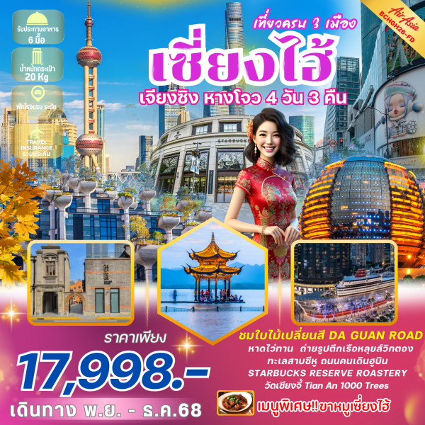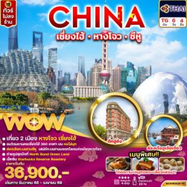เมืองซางเหรา – Shangrao Wanli Times Square – หุบเขาเทวดาหวังเซี่ยนกู่ - หมู่บ้านหวงหลิง (รวมกระเช้า) – ถนนน้ำฮวาซี (Huaxi Water Street) – สะพานเหล่ยซิน (Leixin) เมืองหางโจว – ย่าน Xihu Tiandi – ทะเลสาบซีหู (ไม่รวมล่องเรือ)