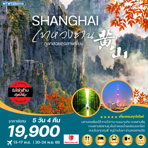 ทัวร์จีน หังโจว หวงซาน ภูเขาหวงซาน เขาสวยสุดแดนมังกร ดุจภาพเขียนพู่กัน 5 วัน 4 คืน