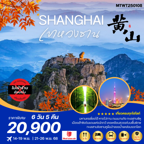 สวนป่าไม้ลอยน้ำชิงซานหู– เมืองถุนซี(หวงซาน) ถนนโบราณถุนซีเหล่าเจีย - เมืองถุนซี – นั่งกระเช้าขึ้นภูเขาหวงซาน-เที่ยวชมอุทยานเขาหวงซาน- หมู่บ้านโบราณมรดกโลก หงชุน - เมืองถุนซี – หมู่บ้านโบราณหวงหลิ่ง-พิพิธภัณฑ์อาหารหุยโจว - วู่หนีโจว-นครหังโจว – ล่องเรือทะเลสาบซีหู- ย่านเหอฝางเจีย – เดินทางสู่สนามบิน
