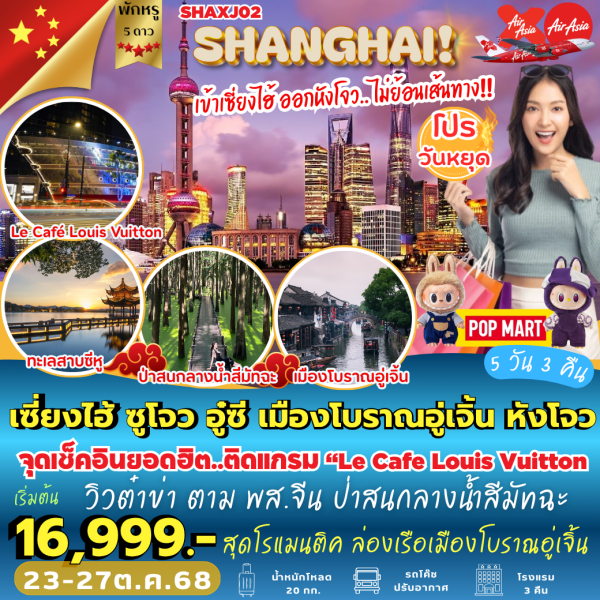 หังโจว-เซี่ยงไฮ้-Shanghai Skywalk-Tian an 1000 trees-ร้านกาแฟStarbucks Reserve Roastery- ชมด้านนอกเรือ LouisVuitton-หาดไว่ทาน- ถนนนานกิง+POP MART - เซี่ยงไฮ้-หังโจว- ทะเลสาบชิงซานหู-ถนนคนเดินหูปินลู่-ถ่ายรูปริมทะเลสาบซีหู-ชมแสงสียามค่ำคืน Hangzhou City Balcony - Sasseur Outlets