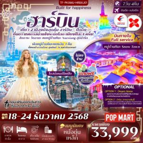 ฮาร์บิน-ร้านเสื้อกันหนาว- เข้าที่พัก-หมู่บ้านหิมะ Xuexiang (รวมค่าเข้า รถรับ-ส่ง)-ป้ายหินใหญ่-พิพิธภัณฑ์หมู่บ้านหิมะ + ที่ทำการไปรษณีย์เมืองหิมะ-ถนนเสวี่ยยุ่นเจีย- หมู่บ้านหิมะหยงอัน-ภาพวาดสิบลี้+เดินป่าหิมะ (ไม่รวมค่ากิจกรรม)-ยาบูลี่-กิจกรรมนั่งรถม้าลากเลื่อน(รวมกิจกรรม)- มู่ตันเจียง - มู่ตันเจียง– ฮาร์บิน-เทศกาลน้ำแข็งนานาชาติ(รวมค่าเข้า)- ฮาร์บิน-บาร็อก-สโนว์แมนยักษ์-อนุสรณ์ป้องกันน้ำท่วม-สวนสตาลิน-ถนนจงยาง + POPMART - ฮาร์บิน-จัตุรัสโบสถ์เซนต์โซเฟีย(ชมด้านนอก) ฮาร์บิน-กวางเจา