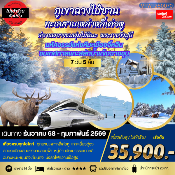• ทัวร์จีน เมืองจี๋หลิน ชมเกล็ดหิมะวู่ซงบนกิ่งไม้ เมืองฉางไป๋ซานล่องแพยางชมพุ่มไม้หิมะ 7 วัน 5 คืน