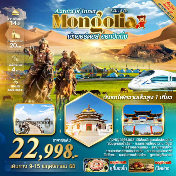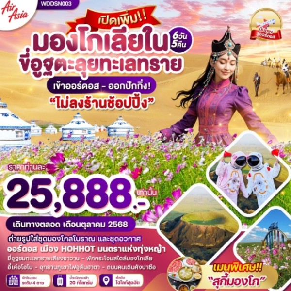 ออร์ดอส มองโกเลียใน - หุบเขาฮวงโห(รวมรถอุทยาน) – เมืองออร์ดอส - น้ำพุคังบาซี - เมืองออร์ดอส–ทุ่งหญ้าออร์ดอส–กระโจมออร์ดอส(สวมชุดพื้นเมืองมองโก+งานรอบกองไฟ) - ชมพระอาทิตย์ขึ้นที่ทุ้งหญ้าออร์ดอส – ทะเลทรายเสี่ยงซาวาน(รวมกระเช้า) – ขี่อูฐชมทะเลทราย - เมืองออร์ดอส - ศูนย์วัฒนธรรมมองโกลหยวนหลิว – วัดพระโพธิสัตว์อุลาน – อิเค่เอ๋าเปา – ถนนคนเดินคังบาชิ