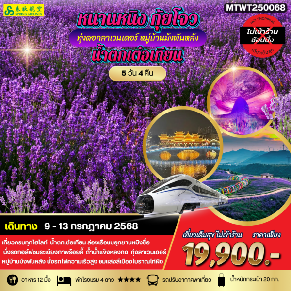 เมืองกุ้ยหยาง-หอเจี่ยซิ่วโหลว -วัดเฉียนหมิงกู่ซื่อ-อุทยานเสินเฉียนกู่-น้ำตกหวงกั่วซู่ประดับไฟ - เมืองอันซุ่น-สะพานฮัวเจียงแกรนด์แคยแน-เมืองโบราณวูเจียงจ้าย-ชมแสงสียามค่ำเมืองวูเจียงจ้าย - เมืองตุ๊กตาหินประหลาดเยี่ยหลางกู่ – เมืองโบราณชิงเหยียน-พิพิธภัณฑ์เหล้าจีน- เมืองกุ้ยหยาง
