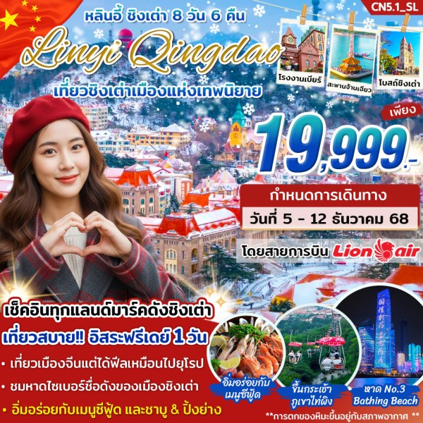 บ้านเกิดหวังซีจื้อ • เข้าสู่โรงแรมที่พัก • ขึ้นหอวิทยุและโทรทัศน์ • ถนนคนเดินหลินอี๋ - ชิงเต่า • วัดจ้านซาน • พิพิธภัณฑ์เบียร์ชิงเต่า • สะพานจ้านเฉียว • โบสถ์ St’Micheal (ชมภายนอก) • ถนนจงซาน • เกาะต้าเป๋า • ถนนหลงเจียง - ซาจือโข่ว • เหลาซานเป่ยจิ่วสุ่ย • เว่ยไห่ • ถนนเวยไห่ทอร์ช • สวนสาธารณะเวยไห่ • ประตูเวยไห่ • ตลาดเกาหลี - เหยียนไถ • ท่าเรือประมงไห่ซาง • ถนนเฉาหยาง • สวนสาธารณะเหยียนไถซาน • เผิงไหล • เผิงไหลเก๋อ • แปดเซียนข้ามทะเล - ชิงเต่า • จุดชมวิวหยุนช่างไห่เทียน • จัตุรัส 54 • ชายหาดหมายเลข 3 ทะเลไซเบอร์ - ชิงเต่า • เดินทางสู่เมืองหลินอี๋ • พิพิธภัณฑ์แผ่นไม้ไผ่หลินอี๋ • ตลาดค้าส่งหลินอี๋ • เมืองโบราณหลังหยา • ชมแสงสียามค่ำคืน ** OPTIONAL SHOW : โชว์ National Splendor Langya