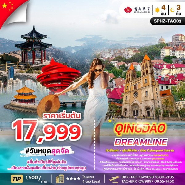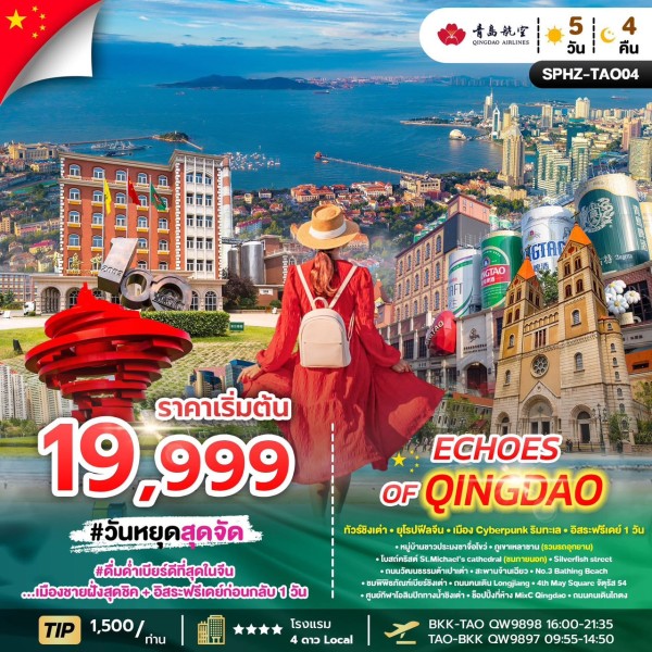 หมู่บ้านชาวประมงซาจื่อโขว่-ภูเขาเหลาซาน(รวมรถอุทยาน)-โบสถ์คริสต์ St.Michael’s cathedral(ชมภายนอก)– Silverfish street-ถนนวัฒนธรรมต้าเปาเต่า–-สะพานจ้านเฉียว–No.3 Bathing Beach - ชมพิพิธภัณฑ์เบียร์ชิงเต่า - ถนนคนเดิน Longjiang-4th May Square จัตุรัส 54-ศูนย์กีฬาโอลิมปิกทางน้ำชิงเต่า-ช็อปปิ้งที่ห้าง MixC Qingdao - ถนนคนเดินไถตง - ปาต้ากวน - ถ่ายรูปกับบ้านพักตากอากาศของท่านเจียงไคเช็ค (ถ่ายรูปด้านนอก)- หาดหมายเลข2 - กระเช้าไท่ผิง(รวมค่าขึ้น) - สถานที่จัดงานเทศกาลเบียร์ - ทางเดินไม้ริมทะเล – ศาลเจ้าเทพแห่งทะเล - เดินเล่นห้าง Wanda