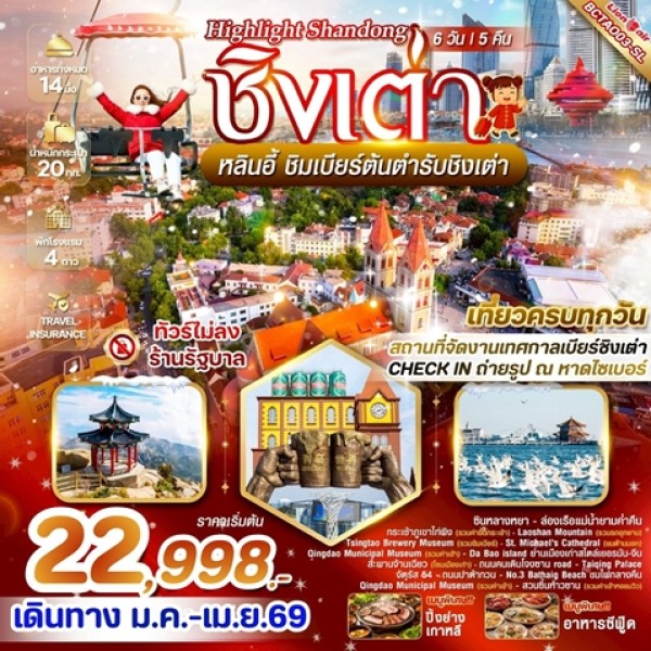 เมืองจี๋หนาน - เมืองจือป๋อ – พิพิธภัณฑ์แก้วเซรามิค - ตลาดปาต้าจ่วย - เมืองชิงเต่า – โบสถ์ St. Michael’s (ด้านนอก) – ย่าน Da Bao ชมเมืองเก่าสไตล์เยอรมัน-จีน - สะพานจ้านเฉียว – ถนนคนเดินจงซาน – ถนนพีฉายย่วน - พิพิธภัณฑ์ทหารเรือชิงเต่า - หมู่บ้านประมงซาจือโข่ว – โรงงานเบียร์ชิงเต่า (ชิมเบียร์ฟรี) – จัตุรัส 54 - ถนนปาต้ากวน – ช้อปปิ้ง The Mix C Mall – No.3 Bathing Beach - จุดชมวิว Signal Hill – ถนนศิลปะหลงเจียง – ถนนต้าเสวี่ย - ตรอกซิลเวอร์ฟิช - ไถตงไนท์มาร์เก็ต - ชมดอกไม้สวนจงซาน - ภูเขาไท่ผิง (รวมกระเช้า) – เก็บสตอเบอร์รี่สดๆ จากไร่ – เมืองจี๋หนาน - บ่อน้ำพุเป้าทู - ทะเลสาบต้าหมิงหู – ถนนโบราณชวีสุ่ยถิง - ฟูหรงเจียสตรีทฟู๊ด