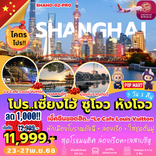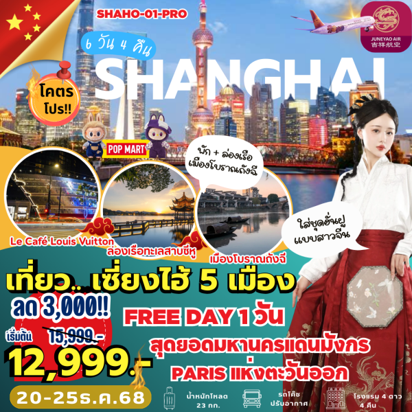 มหานครเซี่ยงไฮ้ –ตลาดเฉินหวังเมี่ยว –หาดไหว่ทาน (หาดเจ้าพ่อเซี่ยงไฮ้) –ถนนนานกิง พาช้อป POP MART –ห้างซิงเย่วไท่กู่ฮุ่ย –ตึกสตาร์บัค – ตึกเรือสำราญ หลุยส์วิคตอง Le Café Louis Vuitton *จุดเช็คอินใหม่ของ พ.ส. จีน* *อิสระอำหำรค่ำ* - เซี่ยงไฮ้ –ซูโจว –สวนโอวหยวน –ถนนซานถังเจีย –อู๋ซี วัดหลิงซาน –เมืองโบราณหุยซาน *อิสระอำหำรค่ำ* - อู๋ซี –ศูนย์สมุนไพรจีนถงเหรินถัง –เมืองโบราณถังฉี (เดินเล่น+ล่องเรือพาย) - ล่องทะเลสาบซีหู –สวนฮวากั่ง –หมู่บ้านชำหลงจิ่ง –ถนน เหอฝั่งเจีย –ร้านผ้าไหมจีน