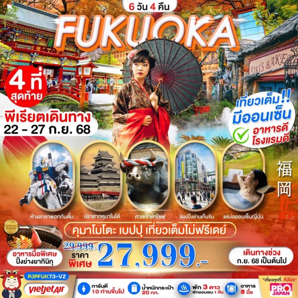 ศาลเจ้าดาโซฟุ - หมู่บ้านยูฟุอิน (สุดพิเศษ มื้อเย็น YAKINIKU BUFFET) - อุมิจิโกคุ - ชิโนอิเกะ - จิโกกุ - สวนดอกไม้ KUJU NONOHANANOSTO - ทุ่งหญ้าคุซาเซนริ - AEON MALL - ปราสาทคุมาโมโตะ - โทสุ - พรีเมี่ยมเฮ้าท์เลต - ลาลาพอท กันดั้ม แห่งฟุกุโอกะ - DUTY FREE - ย่านช้อปปิ้งเทนจิน