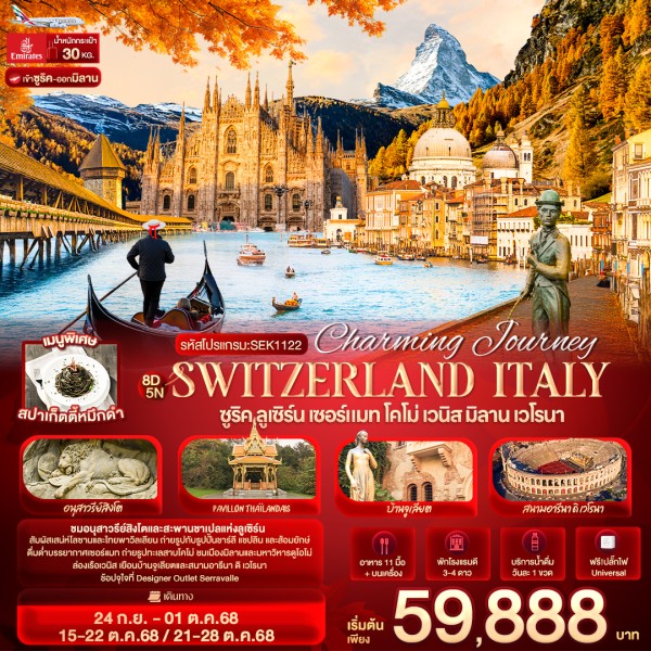ประเทศสวิตเซอร์แลนด์ –เมืองซูริค – ย่านเมืองเก่าซูริค – โบสถ์ฟรอมุนสเตอร์ – โบสถ์หอคอยกรอสมุนเตอร์ –ถนนบานโฮฟซตราสเซอร์ – เมืองซุก – ร้านทำทอง – เมืองลูเซิร์น - เมืองลูเซิร์น – อนุสาวรีย์สิงโตหินแกะสลัก – สะพานไม้ชาเปล – ทะเลสาบลูเซิร์น –ชวาเน่นท์พลัทซ์ – ขึ้นกระเช้าสู่ยอดเขาพิลาตุส – พักบนยอดเขาพิลาตุส - เมืองอินเทอร์ลาเก้น – ทะเลสาบทูน – ถนนโฮวิค – เมืองเลาเทอร์บรุนเนิน – น้ำตกชเตาบ์บาค– เมืองทาซ - นั่งรถไฟสู่เซอร์แมท – เมืองเซอร์แมท – นั่งรถไฟกอร์เนอร์แกรต – ยอดเขาแมทเทอร์ฮอร์น –หมู่บ้านโกล เดอ ปิยง – ยอดเขากลาเซียร์ 3000 – เมืองมองเทรอซ์ - ปราสาทชิลยอง – เมืองเวเว่ย์ – อนุสาวรีย์ชาลี แชปลิน – ส้อมยักษ์ – เมืองโลซานน์ -มหาวิหารแห่งโลซานน์ – ศาลาไทย ณ เมืองโลซานน์ – บันไดไม้โบราณ – Chateau d’Ouchy - มืองเจนีวา – น้ำพุเจ็ทโด้ – ทะเลสาบเจนีวา – โบสถ์เซนต์ปิเตอร์ เจนีวา –กำแพงแห่งการปฏิรูป - จตุรัส ปลาซดูบูร์ก เดอฟูร์