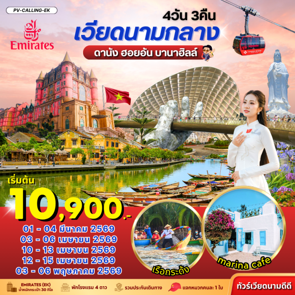 นั่งกระเช้าไฟฟ้าขึ้นสู่บานาฮิลล์ – สะพานมือทองคำ - สวนสไตล์ฝรั่งเศส – อิสระท่องเที่ยวบนบานาฮิลล์ – เมืองดานัง - ร้านหยก - สะพานแห่งความรัก - สะพานมังกร - เมืองดานัง - เมืองฮอยอัน - หมู่บ้านแกะสลักหินอ่อน - หมู่บ้านกั๊มทาน – นั่งเรือกระด้ง - เมืองมรดกโลกฮอยอัน - ดานัง – ร้านผ้าไหม - โบสถ์สีชมพู - ช้อปปิ้งตลาดฮาน - ร้านเยื่อไผ่ - วัดหลินอึ๋ง - คาเฟ่ Sơn Trà Marina (ไม่รวมค่าอาหารและเครื่องดื่ม)